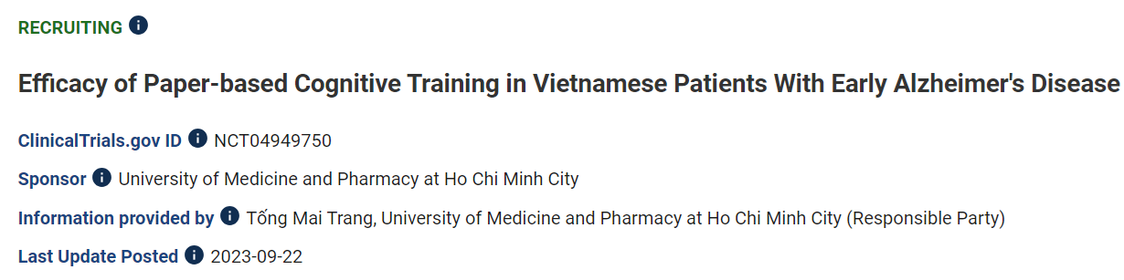 Mục đích nghiên cứu là để đánh giá hiệu quả của tập luyện nhận thức trên giấy ở bệnh nhân Việt Nam mắc bệnh Alzheimer giai đoạn sớm. Từ đó, có thể khuyến cáo tập luyện nhận thức ở người bệnh Alzheimer giai đoạn sớm.